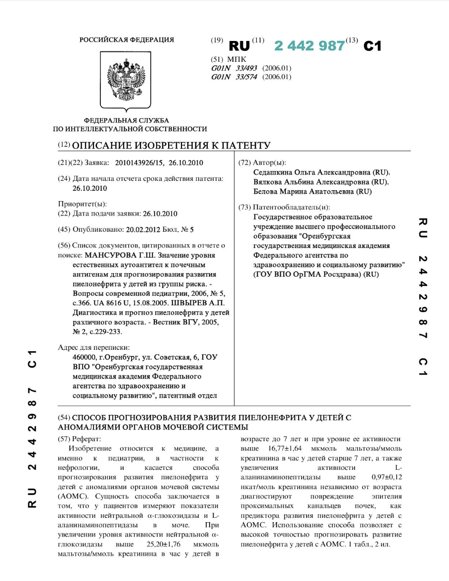 Изобретение относится к медицине, а именно к педиатрии, в частности к нефрологии, и касается способа прогнозирования развития пиелонефрита у детей с аномалиями органов мочевой системы (АОМС). Сущность способа заключается в том, что у пациентов измеряют показатели активности нейтральной α-глюкозидазы и L-аланинаминопептидазы в моче.